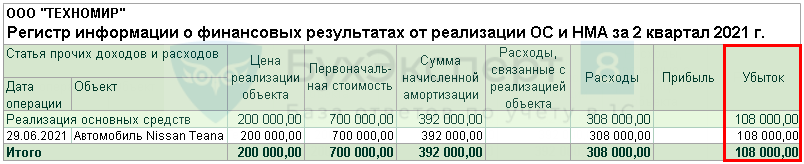 Определите сумму убытка в НУ с помощью отчета Регистр информации о финансовых результатах от реализации ОС и НМА в разделе Отчеты — Регистры налогового учета — 1.9 Финансовые результаты от реализации ОС и НМА.