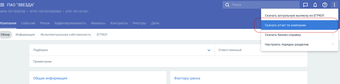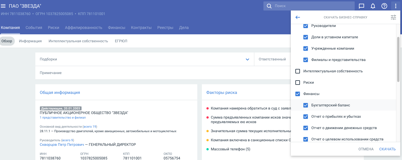 Справка содержит основные сведения о компании, которые помогут принять правильное бизнес-решение относительно сотрудничества с организацией: риски по контрагенту, интеллектуальная собственность, коды по ОКВЭД, финансы, наличие лицензий, госконтракты и обзорная информация по судебным делам.