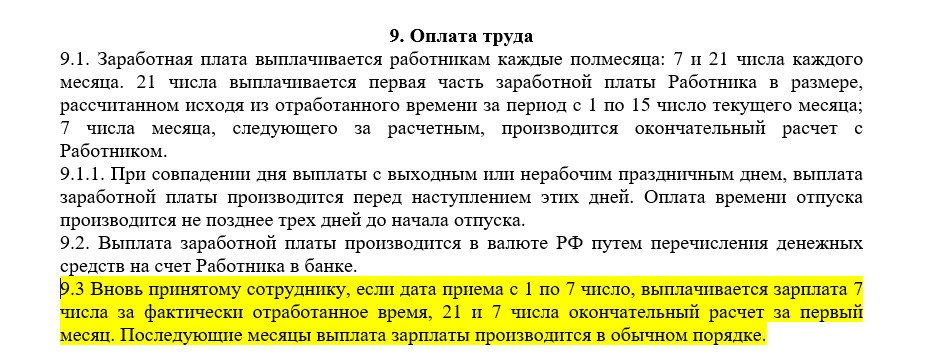 Там же есть раздел «Порядок расчетов». В этом разделе работодатель как раз и пишет, в каких числах месяца выплачивается зарплата.