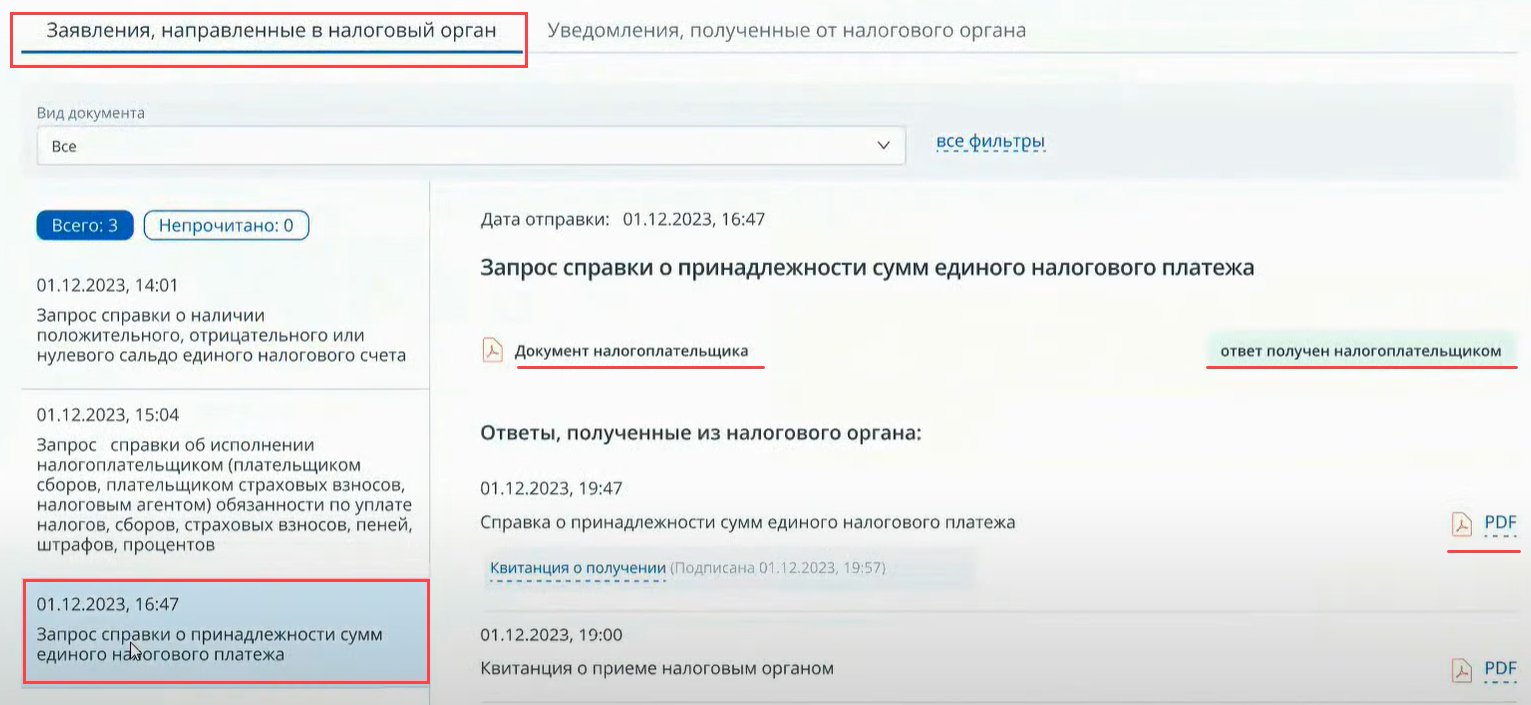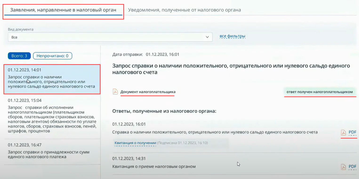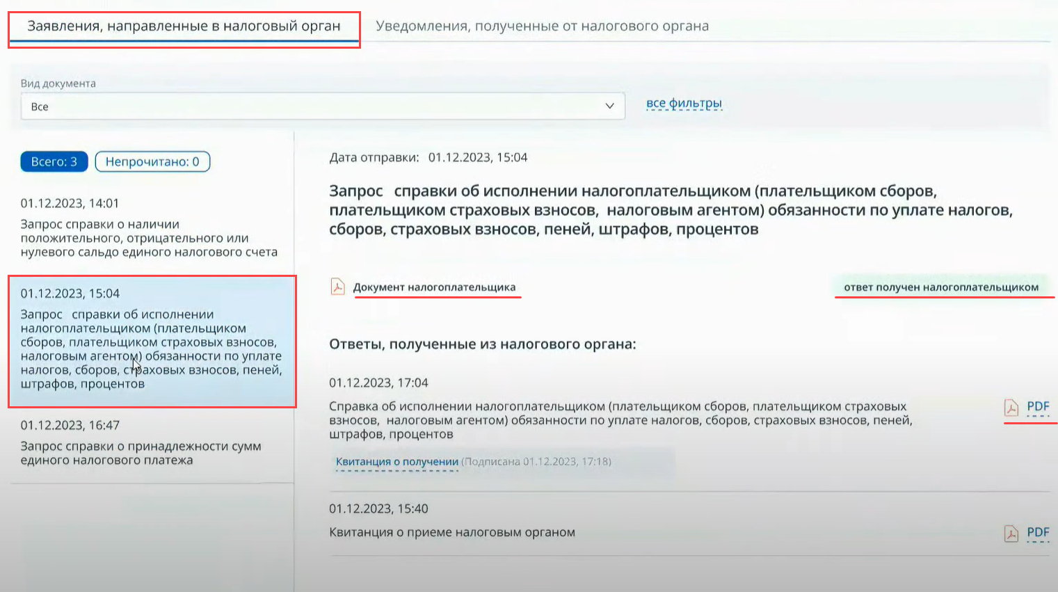 Когда запрос обработан (метка «ответ получен налогоплательщиков»), ответ доступен для скачивания в формате PDF.