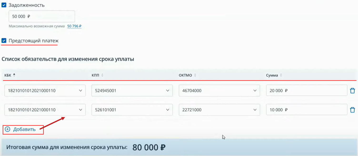 - Предстоящий платеж — добавить изменение срока уплаты по предстоящему платежу. Для этого укажите реквизиты платежа и сумму.