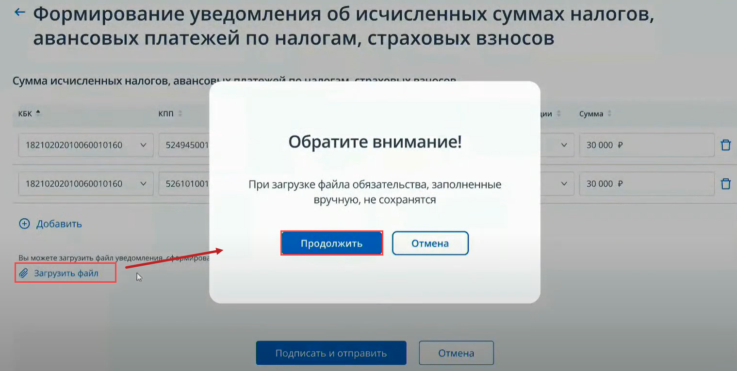 Составленное уведомление отправляется в налоговую по кнопке Подписать и отправить.