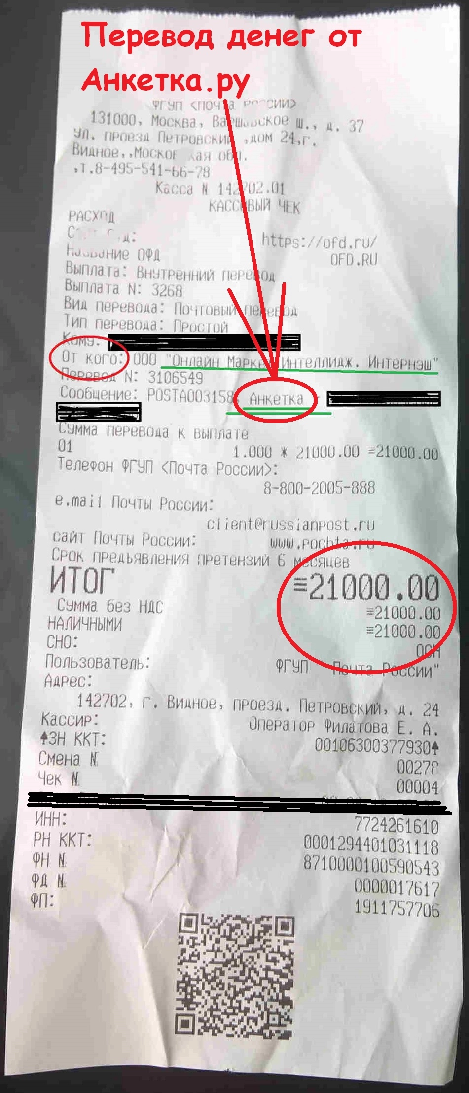 Что это за картинка? А это квитанция почтового перевода. Ранее этот сайт переводил деньги через почту. Сейчас они выводят деньги на карты банков, телефон и платёжные системы. Ещё замечу, что это мой заработок не за один месяц, а по моему месяца за 4-5, уже не помню точно. Отзывы о Анкетка.ру положительные! На нём работает под миллион человек, проходят опросы.