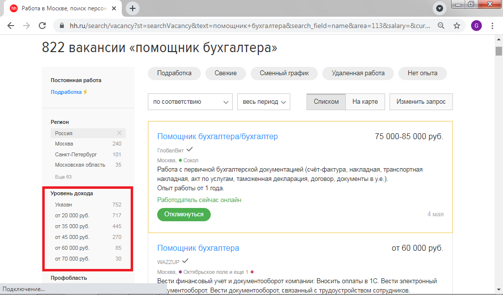 Скрин поискового запроса «Помощник бухгалтера» с сайта hh.ru