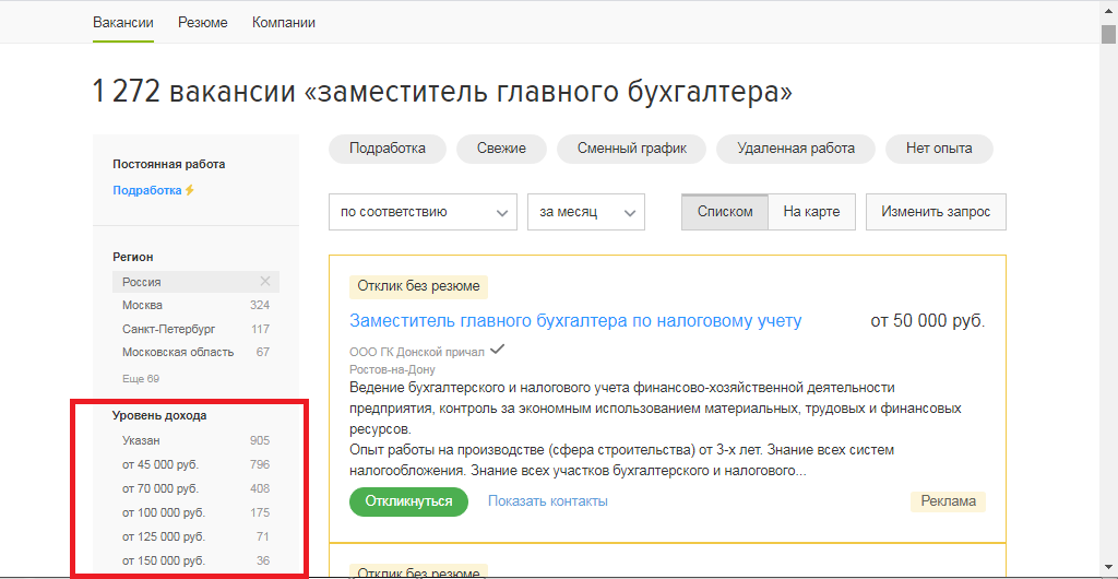 Скрин поискового запроса «Заместитель главного бухгалтера» с сайта hh.ru
