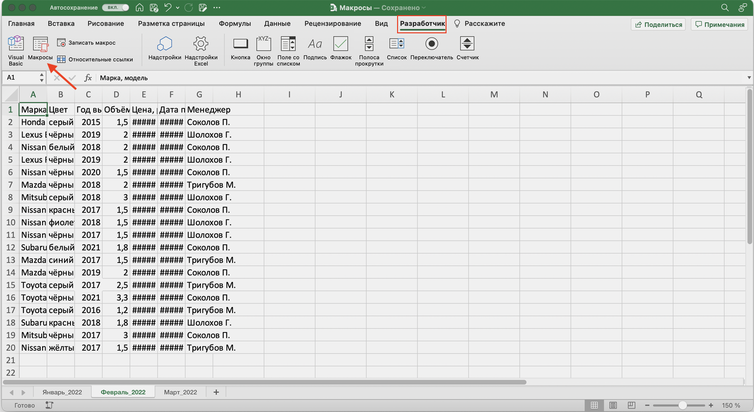 - Перейти во вкладку «Разработчик» и нажать кнопку «Макросы».