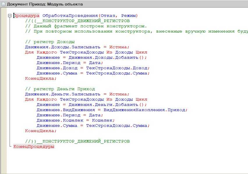 Программа сама сгенерирует программный код который будет выполняться в момент проведения документа Приход. Проведение документа происходит когда вы в документе нажимаете кнопку Провести и закрыть.