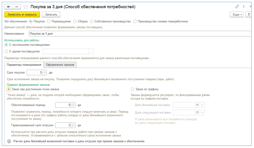 - При возникновении потребностей их обеспечение должно быть запланировано при помощи заказа. Вид заказа определяется способом обеспечения. Для хранения перечня способов удовлетворения потребностей в прикладном решении используется справочник «Способы обеспечения потребностей». Здесь можно указать различные параметры планирования и оформления заказов.