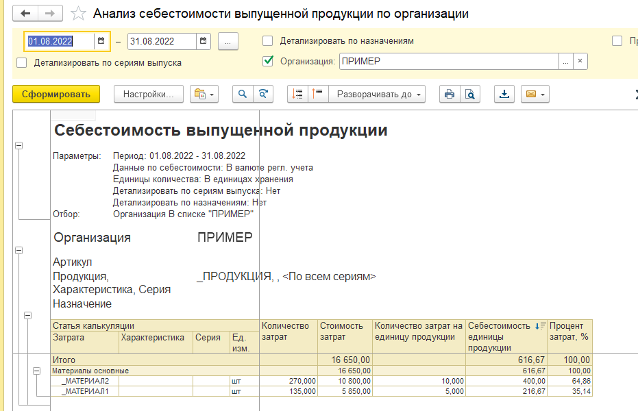 После выполнения процедуры закрытия месяца можно cформировать и анализировать отчеты по себестоимости,