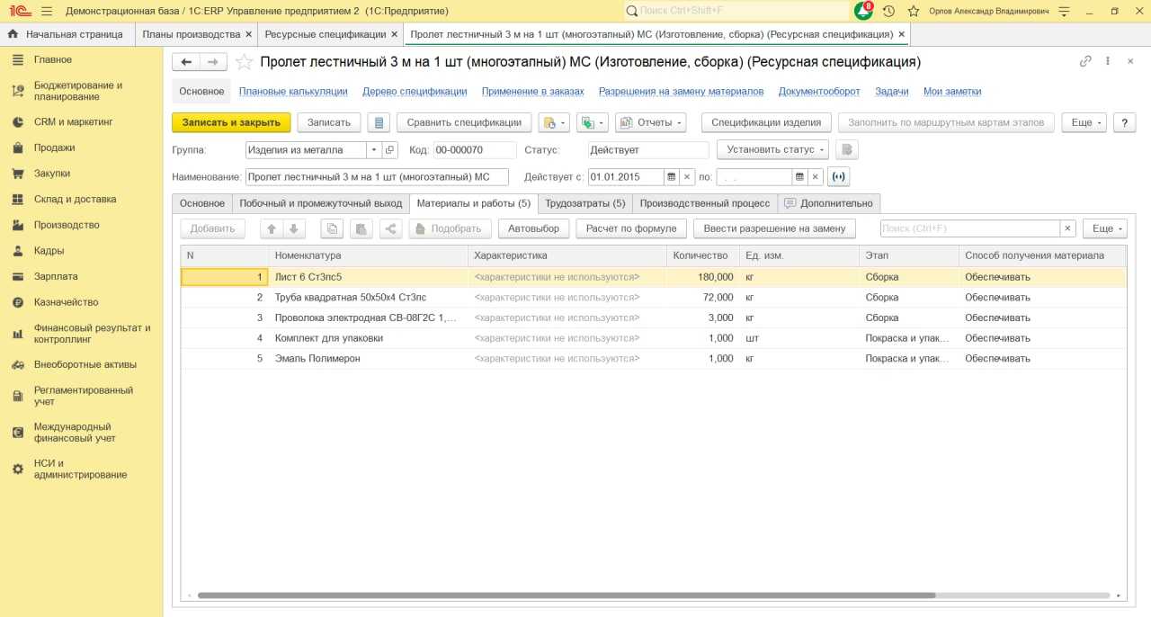 Обратите внимание на Количество — оно задаётся только кратно. Следовательно для производства 1025 кг требуется 2000 полуфабриката или материала, так как спецификация задано на 1000 кг