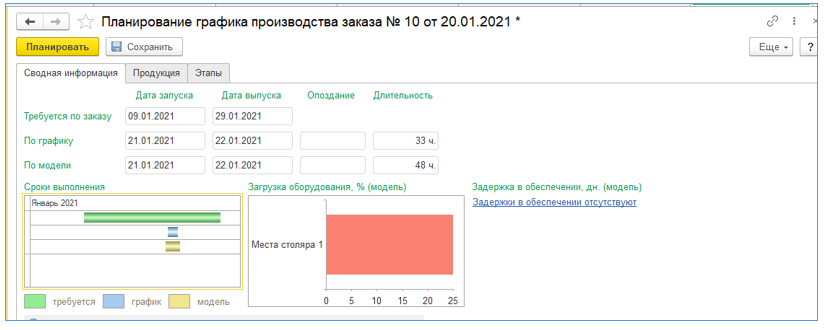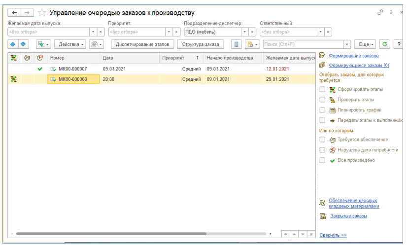 График производства – это расставленные по времени планируемого исполнения этапы производства. Запуск расчета графика осуществляется в рабочем месте «Управление очередью заказов». Можно запланировать как единичный заказ, так и несколько выбранных.
