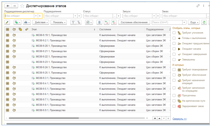 Для диспетчеризации оформленных этапов производства используется рабочее место Производство – Межцеховое управление – Диспетчирование этапов.