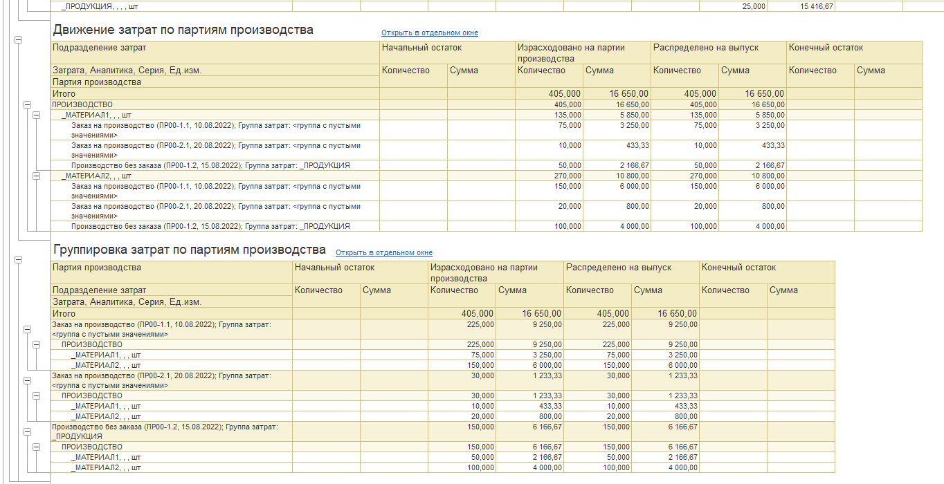 затратам, движениям партий внутри производства. Для нашего примера указанные отчеты будут выглядеть