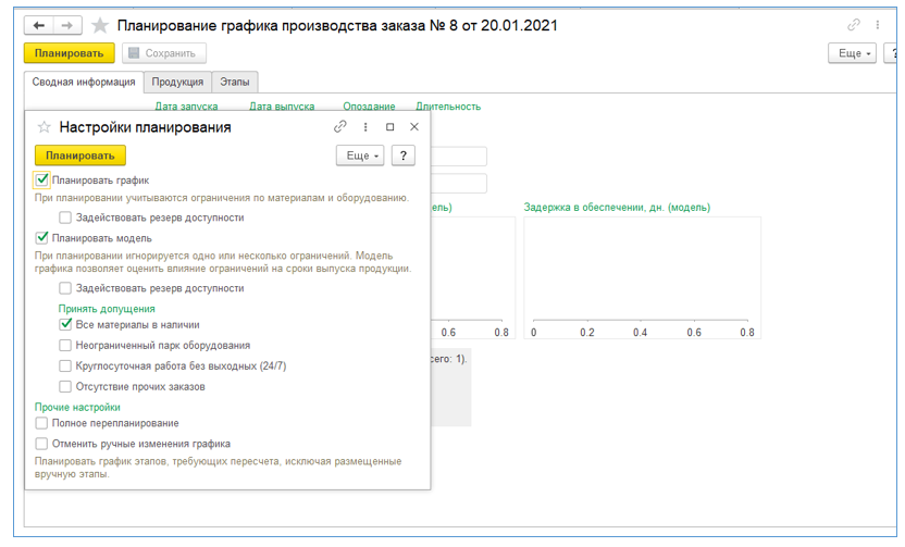 - Планирование по материальным и производственным ресурсам (MRP II). Каждый вариант предполагает регистрацию потребности к производству заказами на производство и управление ходом производства с использованием этапов.