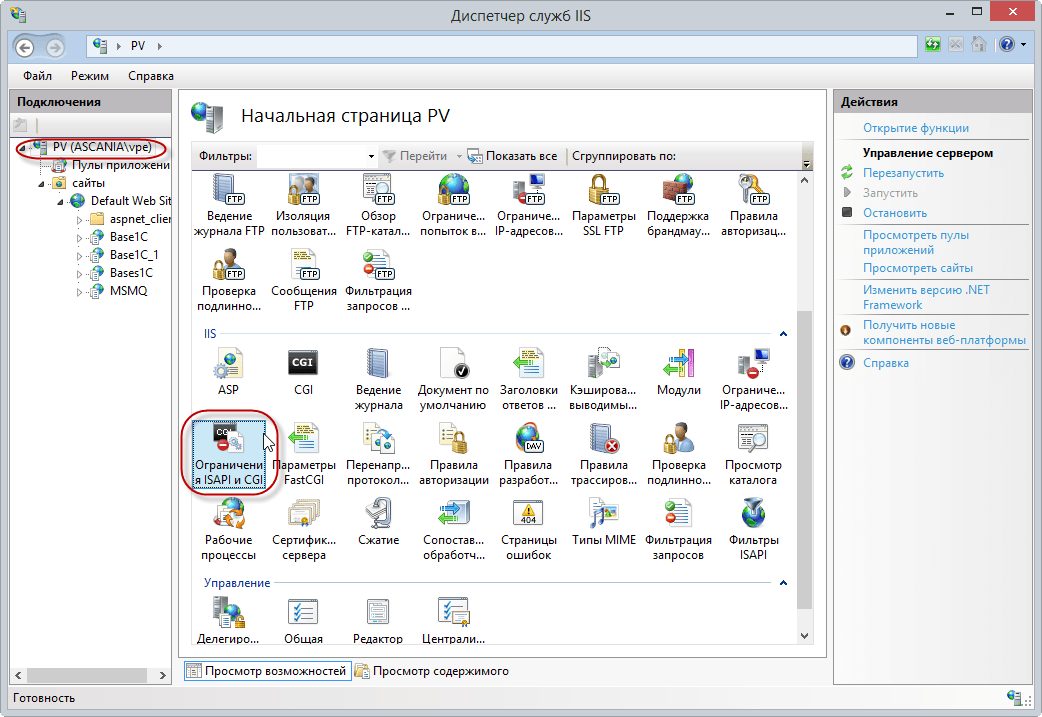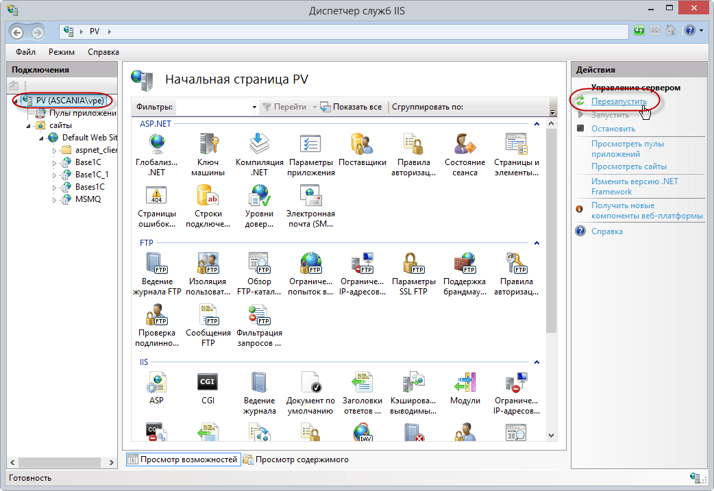 После чего необходимо перезапустить службу IIS. Для этого необходимо перейти в корень панели «Подключения» (на название сервера) и в меню действия справа выбрать «Перезапустить»: