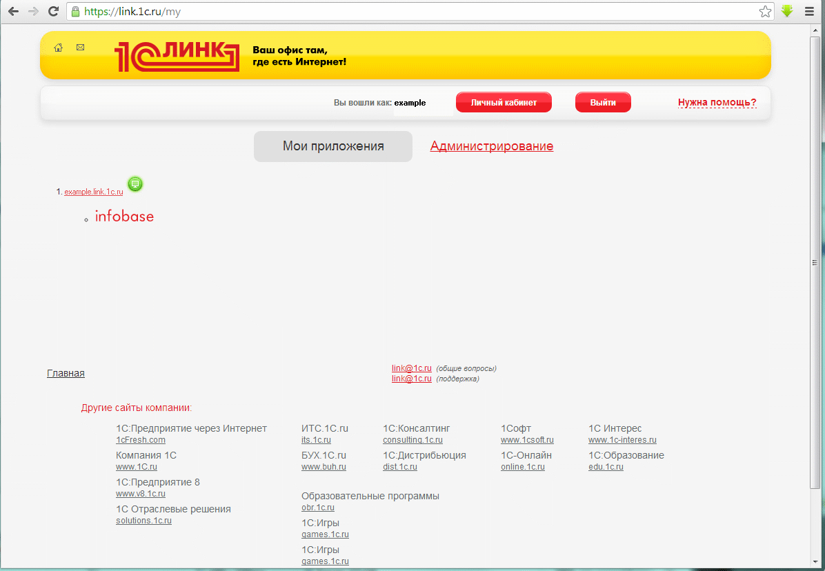 браузере удаленного компьютера свой сайт (xxxx.link.1c.ru) и введите логин и