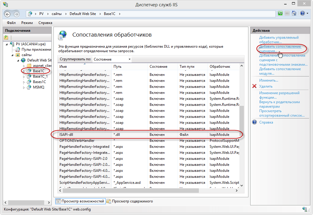 В открывшемся окне ищем строку с именем «ISAPI-dll» и нажимаем пункт меню в действиях «Добавить сопоставление сценария…»