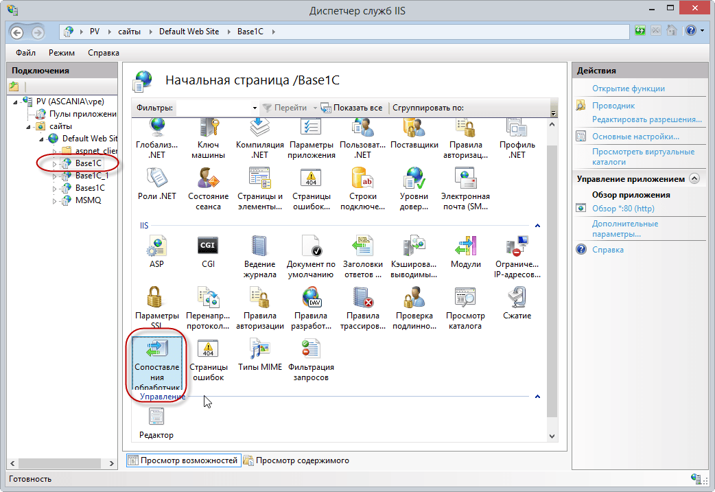 — появился преобразованный в приложение виртуальный каталог с именем, которым мы задавали при публикации базы данных. Для завершения публикации осталось только указать данному приложению использовать 64-разрядный обработчик запросов. Для этого откроем страницу настройки сопоставления обработчиков для данного виртуально каталога, выбрав пункт «Сопоставление обработчиков