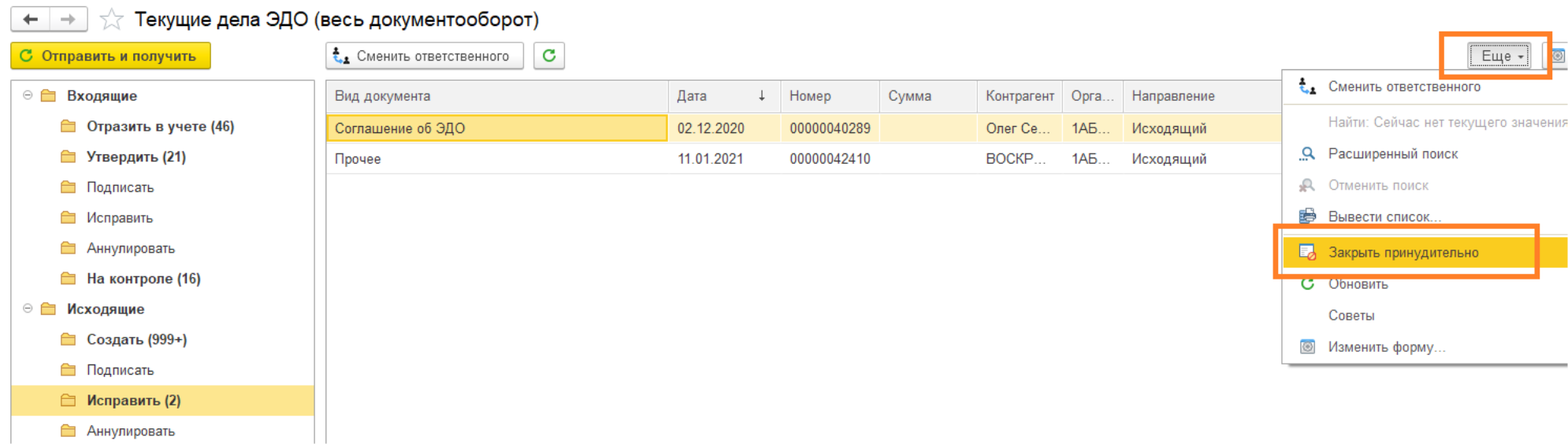 Если электронный документ не будет подписан, его можно «Закрыть принудительно». Выбрав нужный документ в