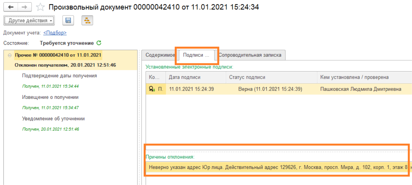 Если во входящем электронном документе обнаружена ошибка, которую следует исправить, это могут быть