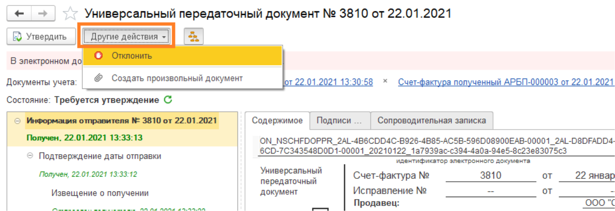 реквизиты, сумма, номенклатура и прочее, документ можно «Отклонить», сообщив об ошибке контрагенту,