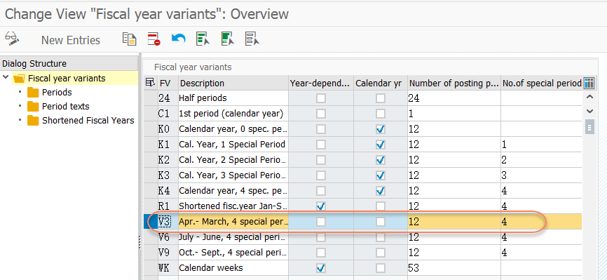 в случаеОтчетный год(Финансовый год) отличается от календарного года. Например, в Великобритании и Гонконге финансовый год компании длится с 1 апреля по 31 марта. В этом случае настройка варианта отчетного периода немного сложнее. Вариант отчетного периода V3, предоставленный SAP, приходится на период с 1 апреля по 31 марта. Давайте рассмотрим основные моменты этого варианта периода.