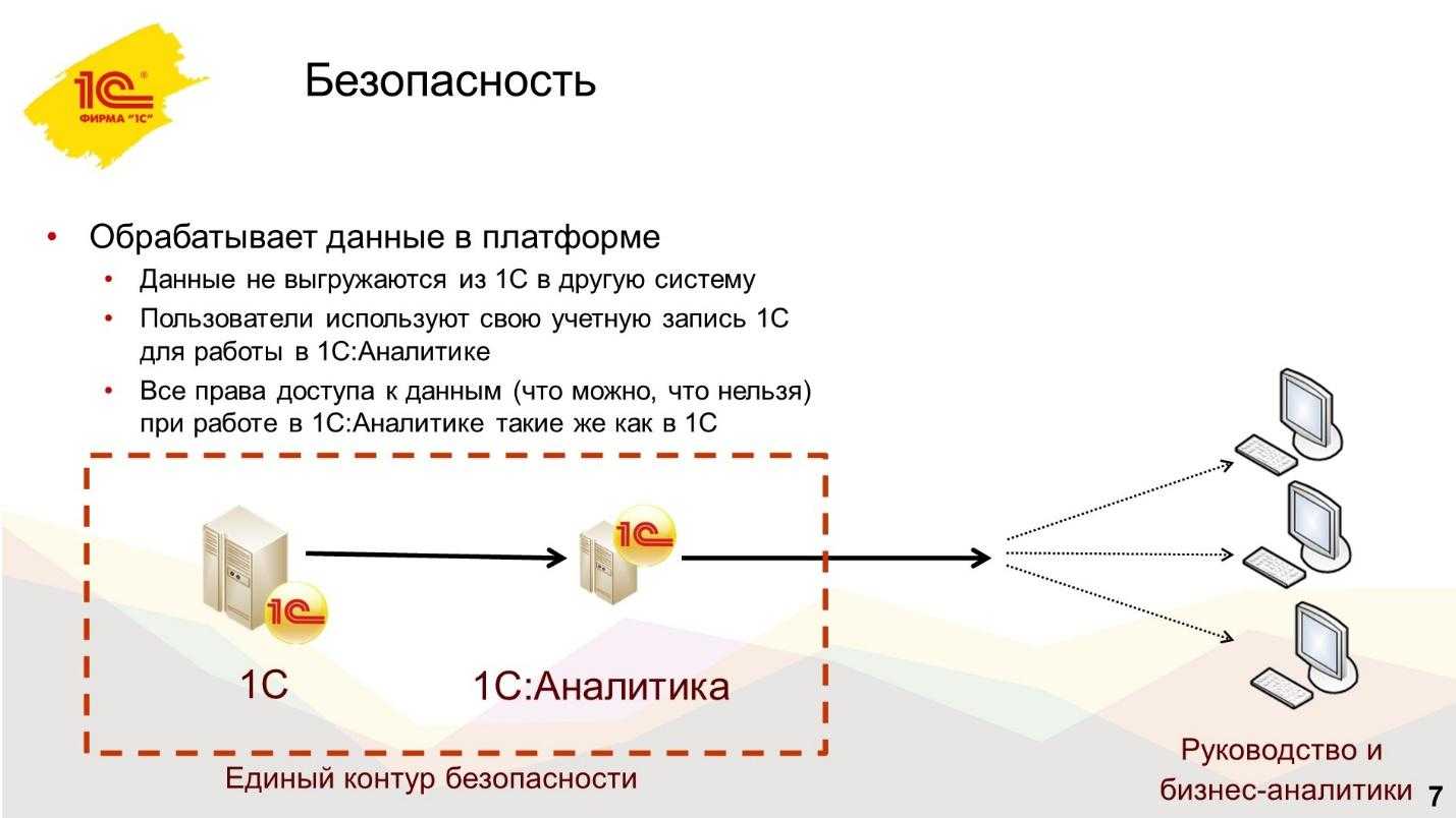 Если вы не выгружаете данные из платформы, а работаете с ними постоянно под теми же правами и настройками безопасности, которые уже настроены в вашей конфигурации, вы можете быть уверены, что при работе с этими данными через 1С:Аналитику уровень безопасности будет ровно такой же. Нет никаких рисков, что данные куда-то утекут. Они остаются внутри платформы