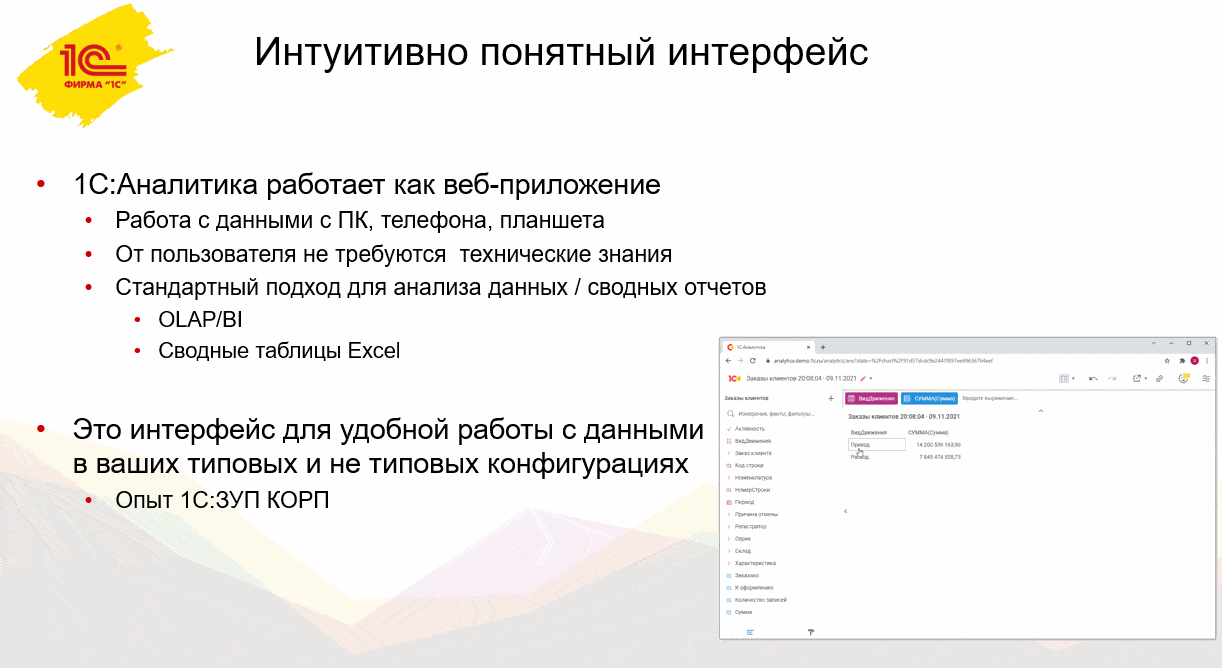 Второй момент – это то, как 1С:Аналитика работает с данными. Этот инструмент позволяет оперативно посмотреть данные, быстро построить аналитический отчет, покрутить данные в разных разрезах, с разных сторон.