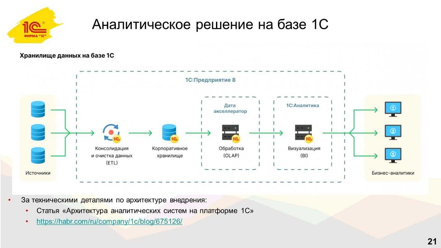 Слайд отображает архитектуру аналитических систем на платформе 1С – подробнее об этом мы рассказывали в статье https://habr.com/ru/companies/1c/articles/675126/. Причем здесь две картинки в одной.