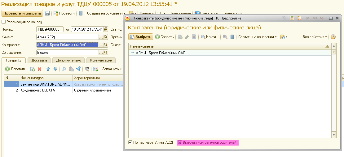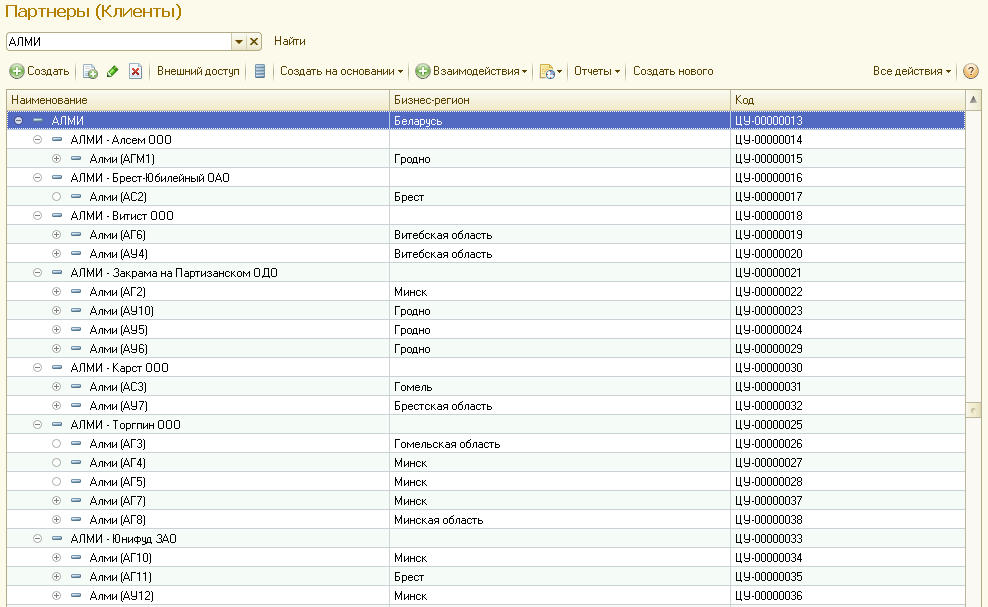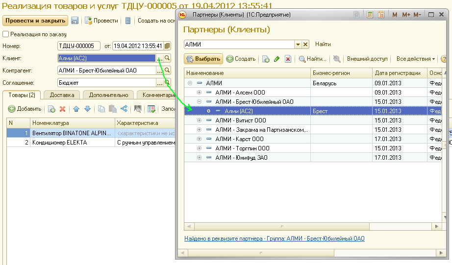 В данном случае у партнера Алми (АС2) нет контрагента, зато он есть у его «родителя» – АЛМИ – Брест-Юбилейный ОАО.