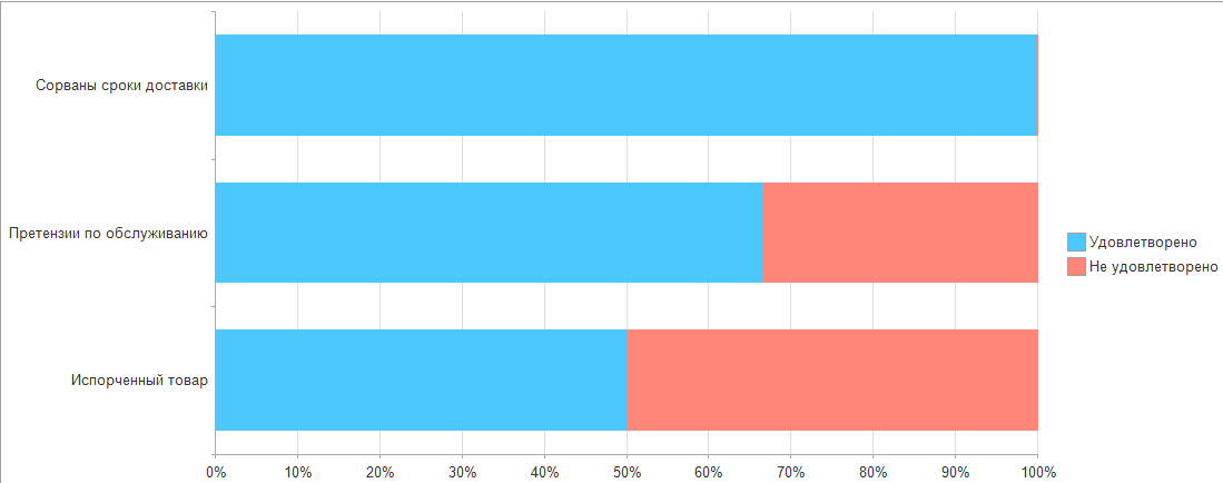 Отчет “Статистика удовлетворения претензий клиентов” предоставляет анализ процента удовлетворения претензий, завершенных в выбранный период, и классифицирует их в зависимости от причин их возникновения.