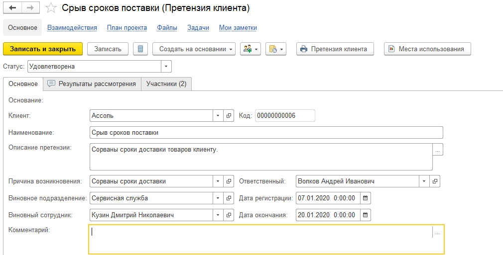 По результатам работы над претензией необходимо установить один из двух статусов в форме претензии: “Удовлетворена” или “Не удовлетворена”, и провести соответствующую документацию.