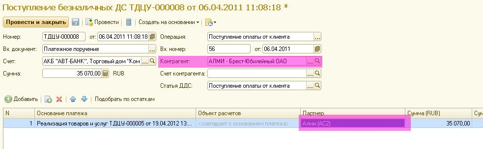 В документ оплаты также заполняется контрагент и партнер:
