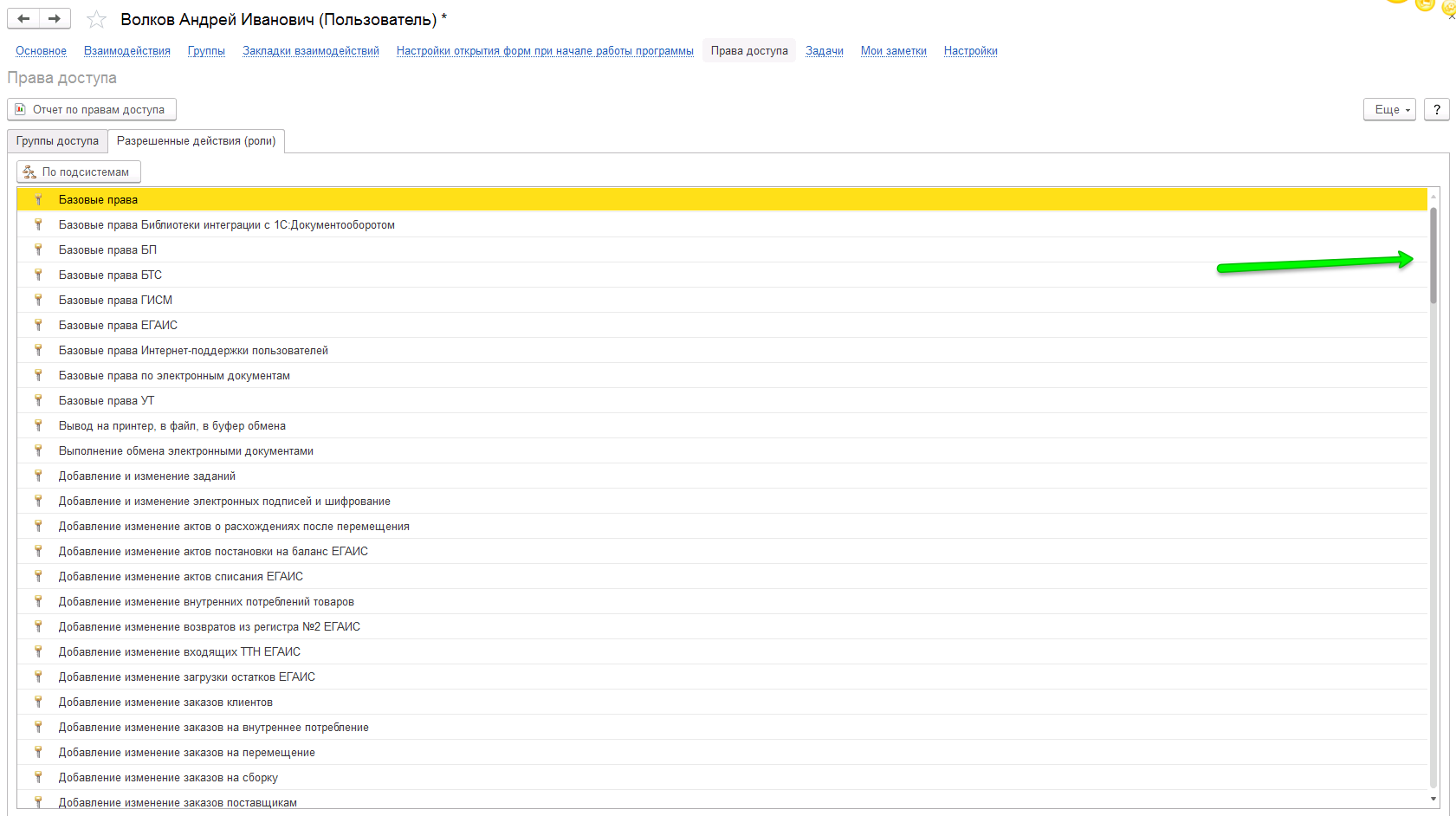 Для каждой роли необходимо настроить права – чтение, редактирование, создание, удаление разных типов документов, справочников, отчетов. Причем, каждое действие (разрешение или запрет) прописывается отдельной строкой в списке прав. Настройка получается долгой и сложной