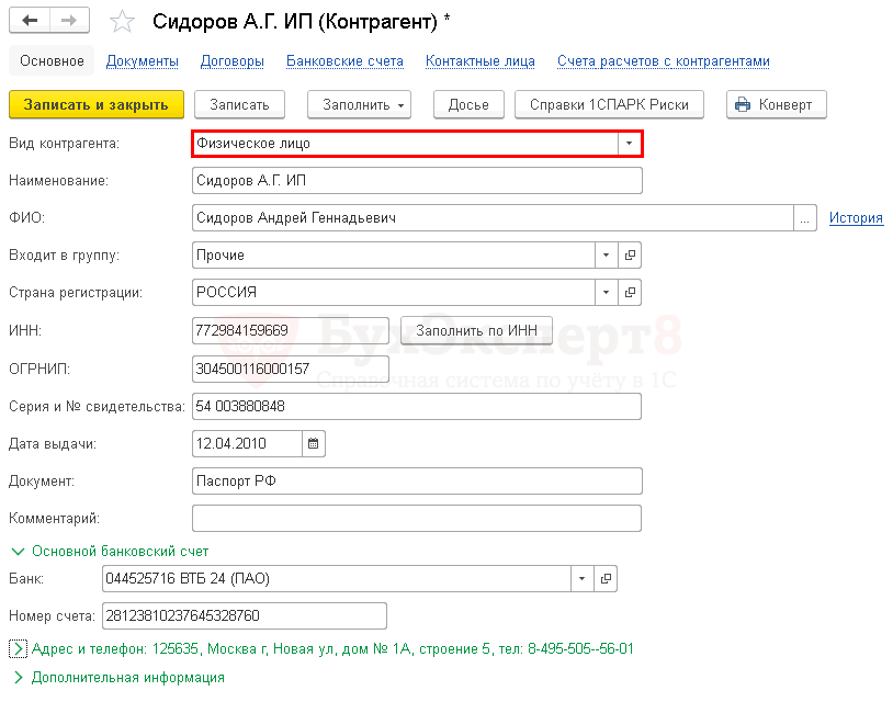 Рассмотрим особенности заполнения карточки физического лица. Они касаются заполнения реквизита ФИО, ИНН, КПП, ОГРНИП и новых полей, активизирующихся при выборе данного вида контрагента.