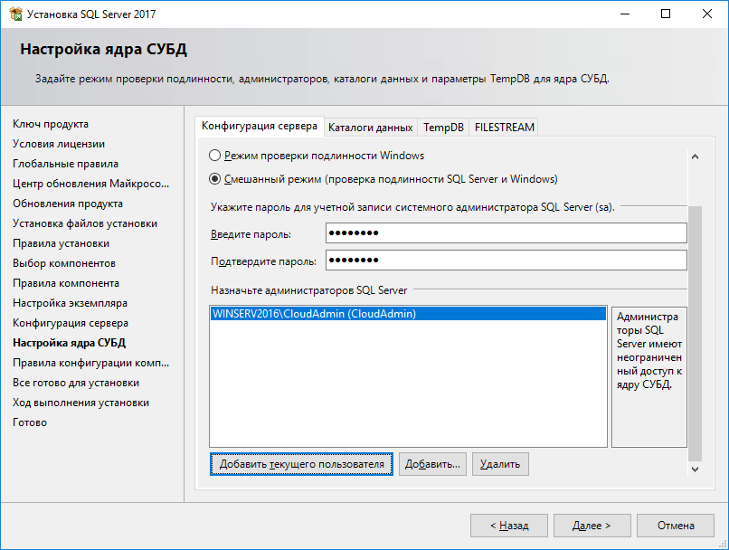 6. В окне «Пользователи SQL-сервера» выберите пользователей, которым разрешен доступ к базе данных. Если пользователи не указаны, добавьте их, нажав на кнопку «Добавить пользователя». Нажмите «Далее».