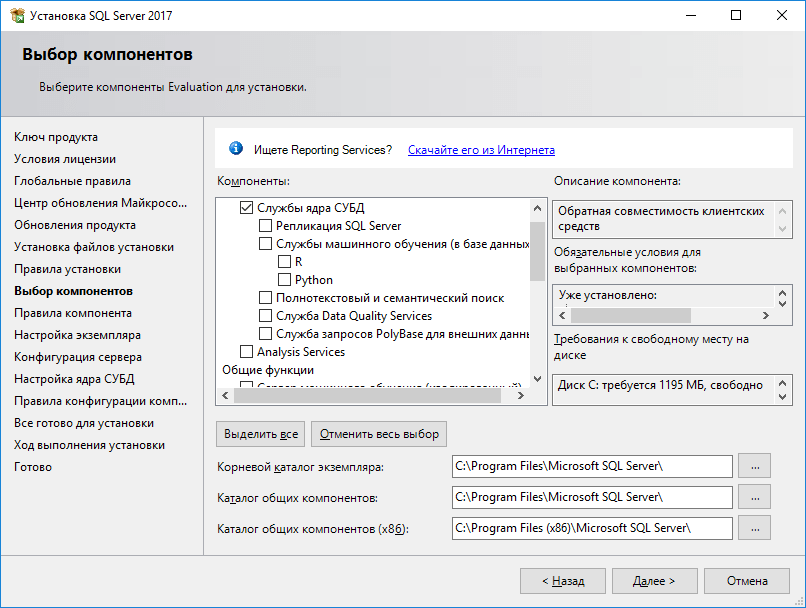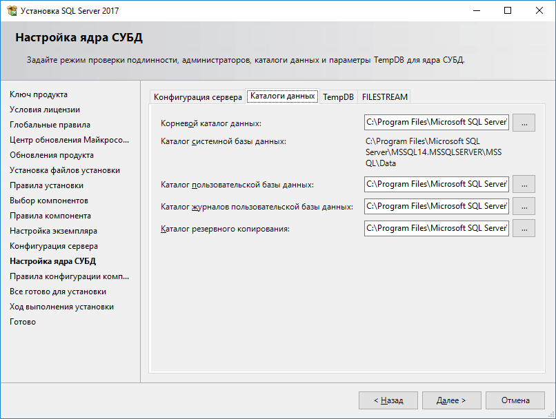 12. В следующем окне выберите место расположения файлов базы данных. Можно оставить значения по умолчанию или выбрать свое место. Нажмите «Далее».