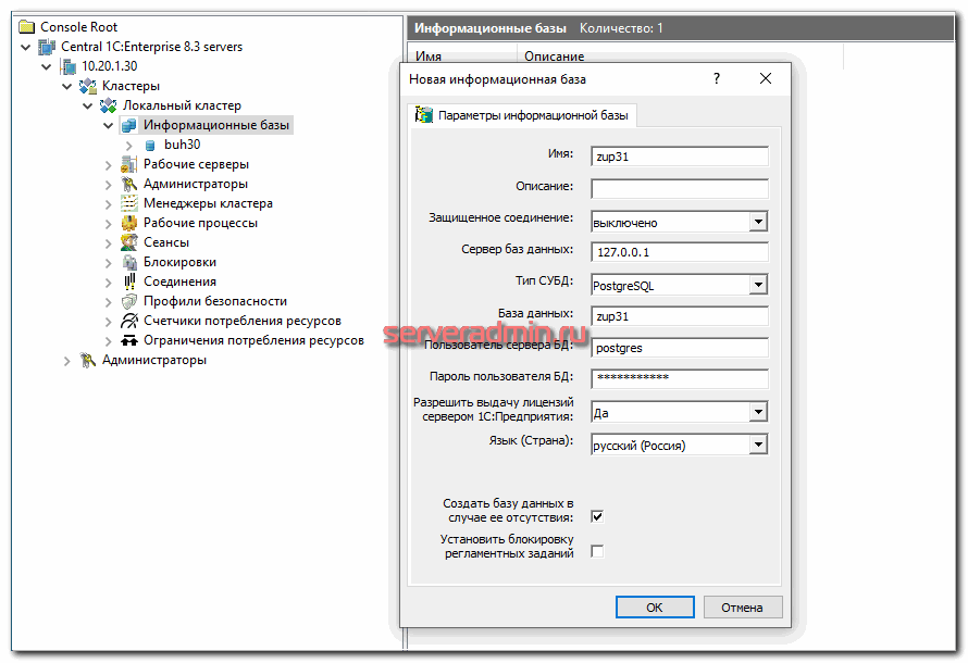 После создания базы данных необходимо настроить ее для работы с 1С. Для этого выполните следующие действия: