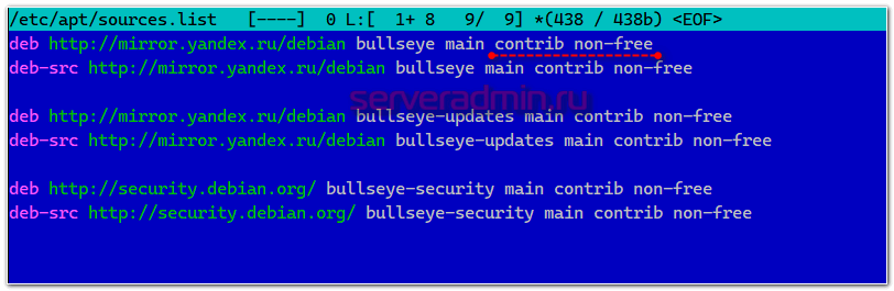deb http://mirror.yandex.ru/debian bullseye main contrib non-free deb-src http://mirror.yandex.ru/debian bullseye main contrib non-free deb http://mirror.yandex.ru/debian bullseye-updates main contrib non-free deb-src http://mirror.yandex.ru/debian bullseye-updates main contrib non-free deb http://security.debian.org/ bullseye-security main contrib non-free deb-src http://security.debian.org/ bullseye-security main contrib non-free