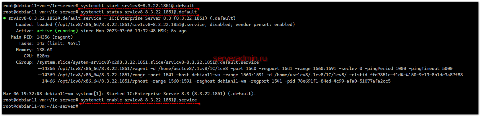 # systemctl start srv1cv8-8.3.22.1851@.default # systemctl enable srv1cv8-8.3.22.1851@.service