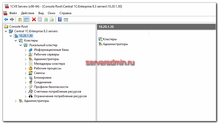 Консоль или утилита администрирования кластеров 1cv8 servers.msc представляет собой подключаемый модуль MMC (Microsoft Management Console), и может быть использована на компьютерах, на которых установлено соответствующее программное обеспечение. По умолчанию устанавливается в папке C:\Program Files (x86)\1cv8\common