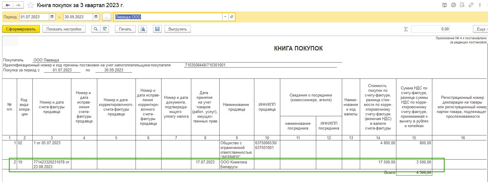 В Книге покупок (раздел Отчеты – Книга покупок) будет запись с кодом вида операции 19, номером и датой отметки ФНС на заявлении о ввозе. Графа 7 не заполняется