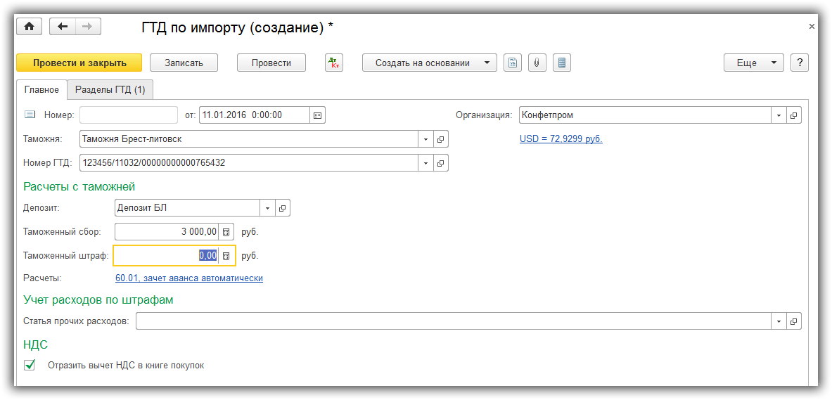 Создадим на основании поступления товаров документ «ГТД по импорту». В документе нужно указать контрагента-таможню и два договора с таможней: один в рублях, а второй в валюте поступления товаров.