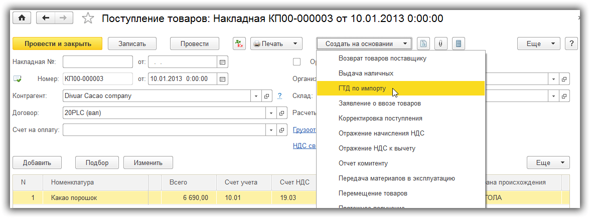 Оформление пошли импортного товара в 1С 8.3 оформляется с помощью заполнения документа «ГТД по импорту».