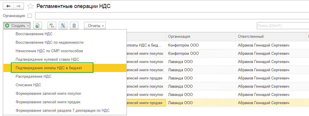 (Отчеты – Отечность по НДС) или из Регламентных операций по НДС