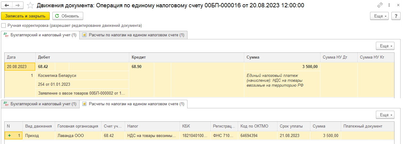 Для перечисления налога в бюджет перечислите денежные средства на единый налоговый счет. Списание с ЕНС суммы НДС по товарам, ввезенным из ЕАЭС должно производиться налоговыми органами 20 числа месяца, следующем за месяцем принятия к учету ввезенных товаров (п. 19 Протокола о косвенны налогах). Отразите задолженность перед бюджетом документом Операция по ЕНС с видом Налоги (начисление) (раздел Операции – ЕНС – Операции по счету).