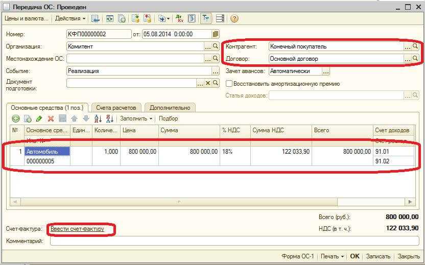 Поясним, что интерес представляет продажа именно основных средств, числящихся на балансовом счете 01 «Основные средства». То есть, имущества, при оприходовании которого изначально не предполагалась его дальнейшая продажа (в противном случае, данное имущество учитывалось бы в составе товаров, и операции по его реализации по договору комиссии достаточно хорошо описаны и автоматизированы).