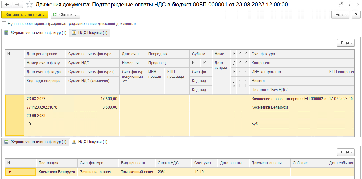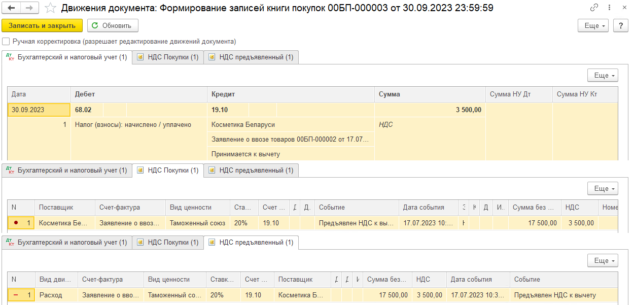 Также в регистре накопления НДС Покупки вносится запись без события и стоимости