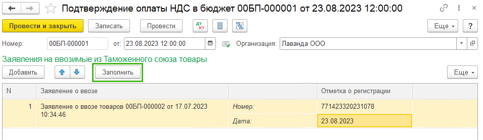 В документе заполните табличной часть по кнопке Заполнить. Во вкладку Приобретенные ценности попадет заявление о ввозе товаров