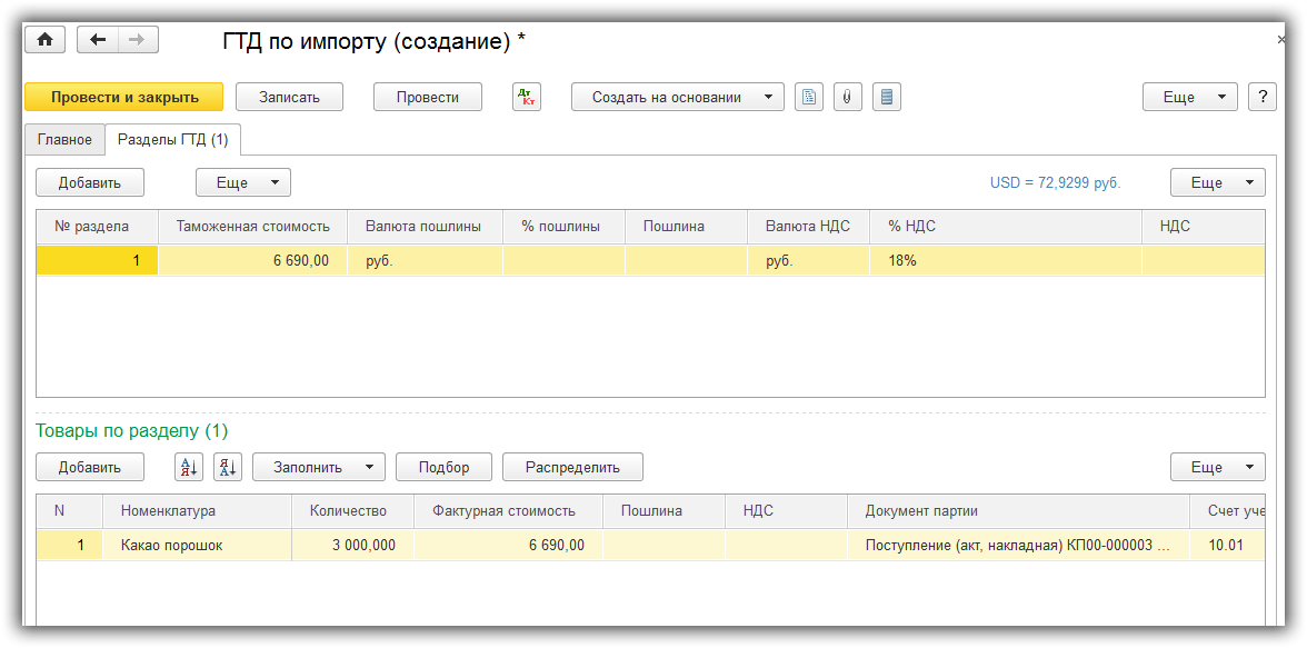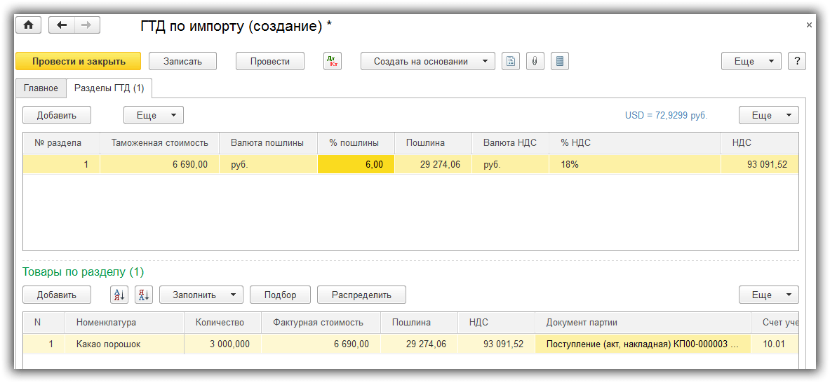 Переходим к вкладке «Разделы ГТД». Здесь указывается размер пошлины. Из-за того, что мы вводили документ на основании, система нам уже заполнила некоторые поля, такие как количество, таможенная стоимость, фактурная стоимость и документ партии: